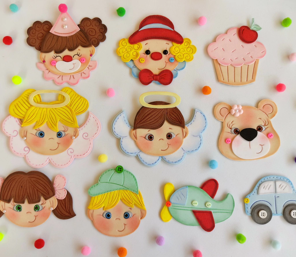 • Os moldes podem ser usados em lembrancinhas, ponteiras, sacolinhas de eva, chaveiros, saquinhos com balas, caderninhos, etc.